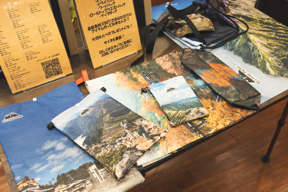 お気に入りの写真やデザインを、防水性や耐久性に優れる素材・D50Tを使用したアイテムにプリントできる、店舗限定サービスを展開。アイテムの種類は、ドライバック、スタッフサック、グラウンドシートなど。