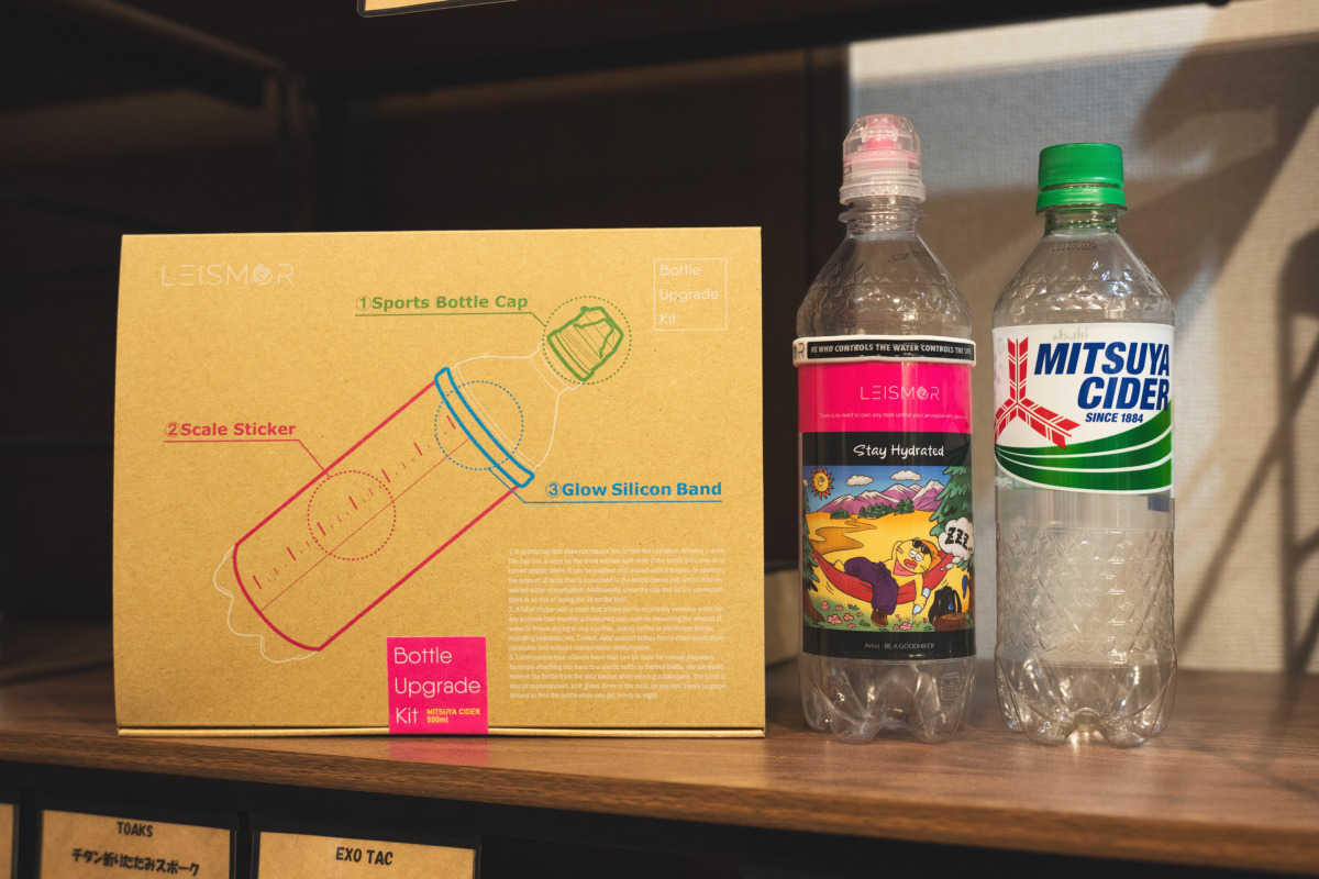 市販の三ツ矢サイダーのボトル(500㎖)をカスタムして再利用できるおもしろアイテム。キットには、スポーツボトルキャップ3色、メモリ付きのラベルステッカー2個、蓄光タイプのシリコンバンド2本入り。