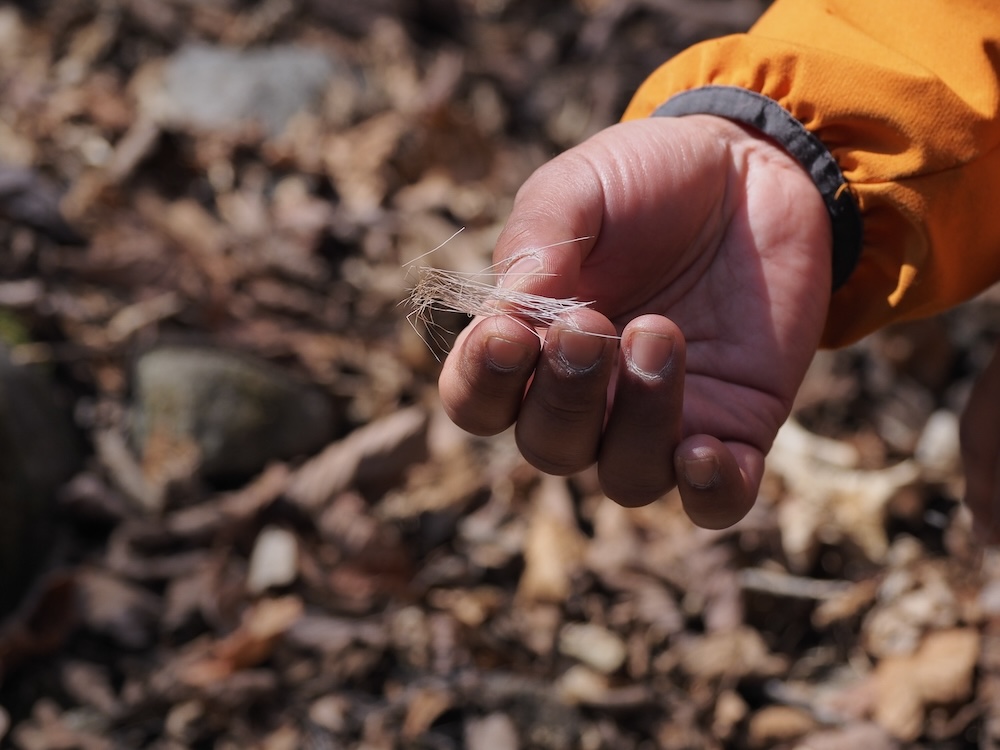 何の変哲もないように見える斜面で、彼はふと立ち止まる。視線の先には「通し」と呼ばれる獣道。足跡や、鹿が角を擦り付けた木肌の痕跡。言われると、確かにそこには彼らの道が浮かび上がってくる。
