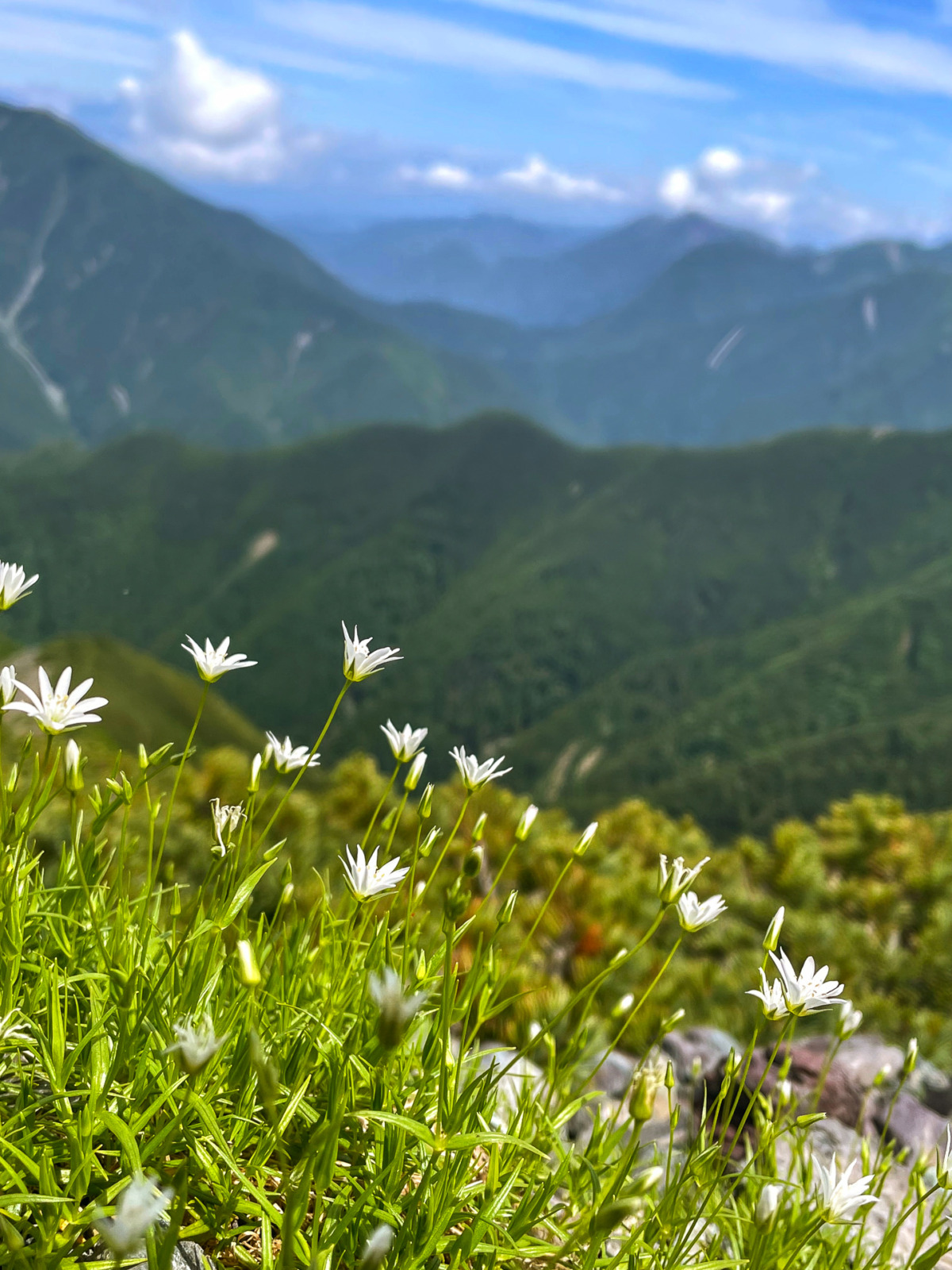 稜線に出ると、鳳凰三山や甲斐駒ヶ岳、そして遠くに富士山まで望むことができました。足元にはまさに花の楽園。ハクサンイチゲやイワツメクサ、イワベンケイ……など、初めて目にする花々が咲き誇っています。