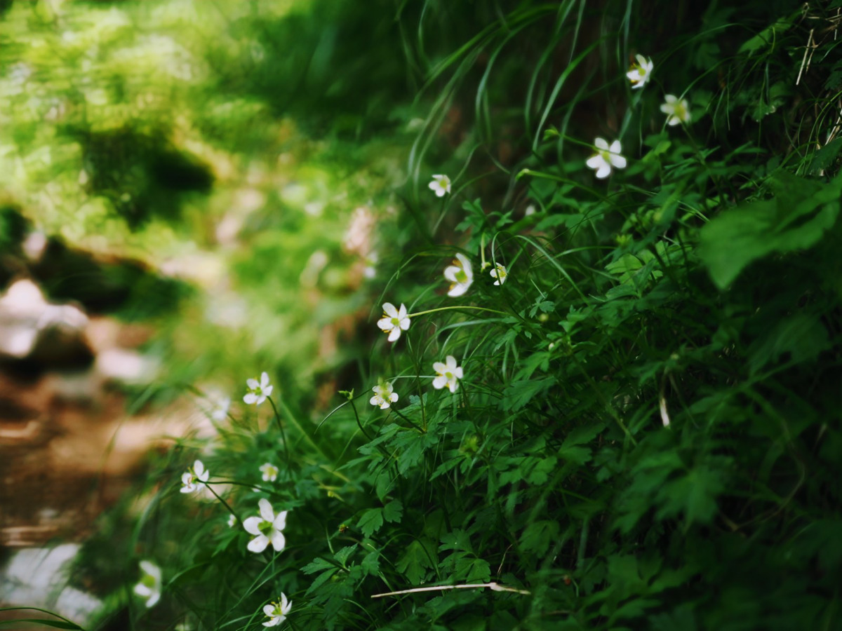 翌朝は小屋のおいしい朝食をいただいたあと、朝の澄んだ空気のなかを出発。小屋裏手の「草すべり」はその名のとおり急な登りで、上り始めから一歩が重く感じられます。それでも足元には初めて見る色のスミレや、かわいいキンポウゲが揺れ、くじけそうな心を励ましてくれました。
