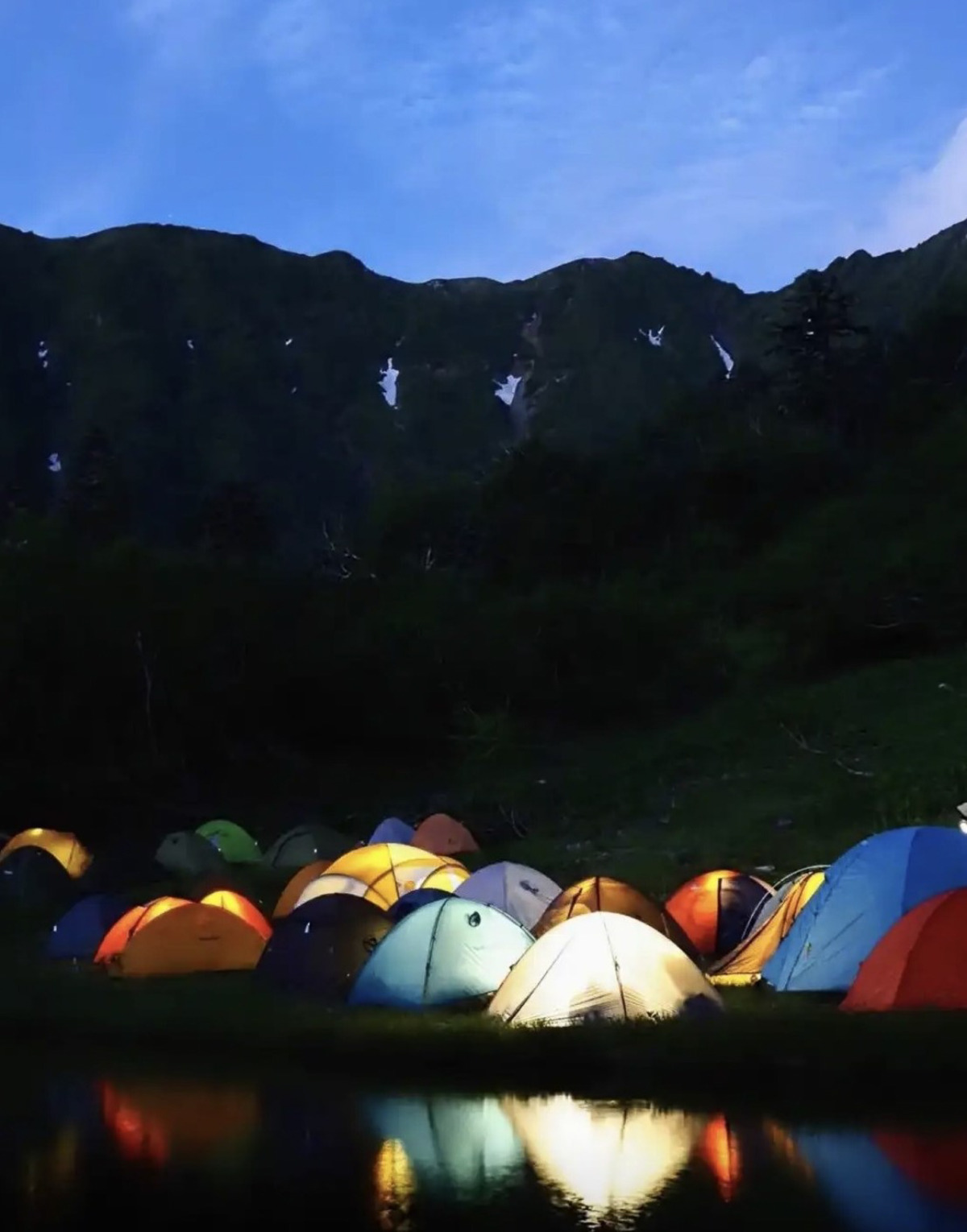 この行程が心にゆとりを生み、キソチドリが咲く豊かな樹林帯や景色を写真に収めるぜいたくな時間を楽しみました。辿り着いた小屋の温かい食事と落ち着いた空間に、登山の緊張も自然とほぐれました。とくに夕暮れ時、池の水面に色とりどりのテントの灯りが揺れる光景は、息を呑むほど幻想的なひとときでした。