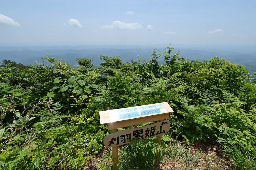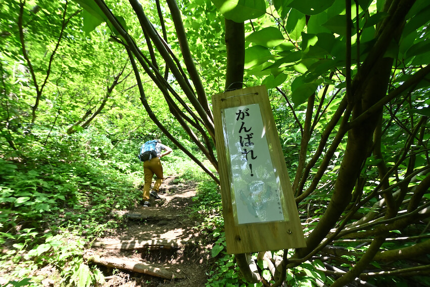 新潟県柏崎市に位置する刈羽黒姫山は標高891mの低山。5つの歩行コースがあり、最も短い磯之辺コースは約1時間で山頂に立つことができます。磯之辺コースは1合目から山頂まで手描きの看板があり、「がんばれ!」「もうちょっと!」とかわいらしいエールに励まされ、急な登りもなんのその!