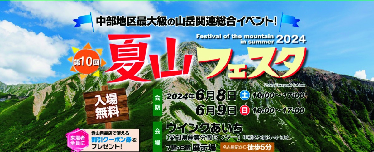 登山用品メーカーや地方自治体などが集結する、中部地区最大級の山岳関連総合イベント「夏山フェスタ」が、6月8日(土)、9日(日)の2日間で開催される。