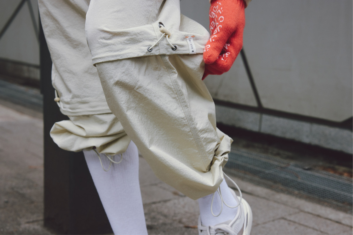 特にボトムスは、ヒザ下のジッパーによってセパレートが可能な2ウェイ仕様。裾だけでなくジッパー上部にもドローコードが配置されており、絞り具合によってシルエットを大胆に変化させることができる。