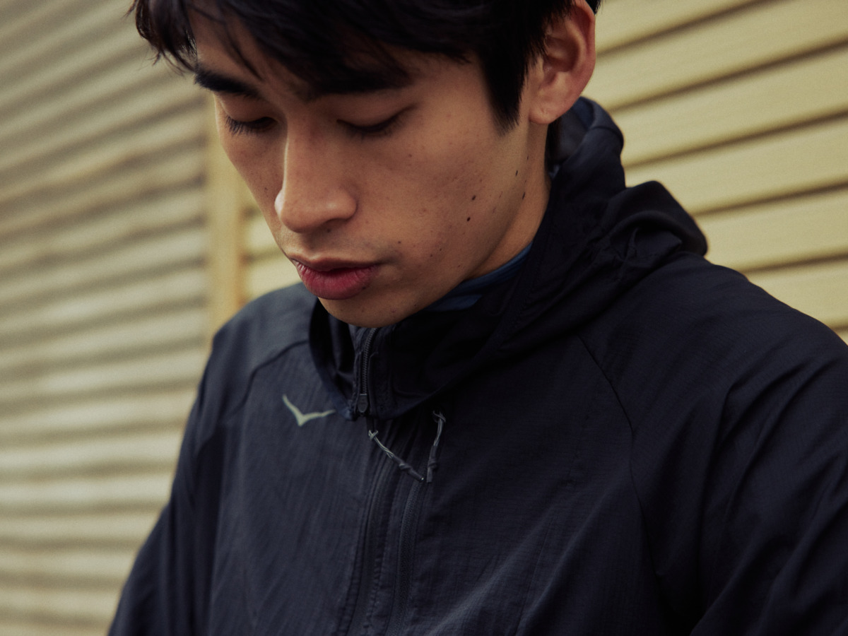 アウターのジャケットは、ラン時に気になる、生地がこすれ合う音を軽減する工夫が凝らされたウインドブレーカー。そのうえ超軽量な素材を使用しているため、余計なことに気を取られず、走ることに気持ちを傾けることができる。