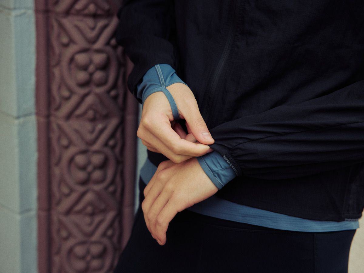 インナーのロングスリーブの袖口には親指をかけられるフック付き。風の侵入を防いでくれるので、気温が低い際のランではとくに重宝する。