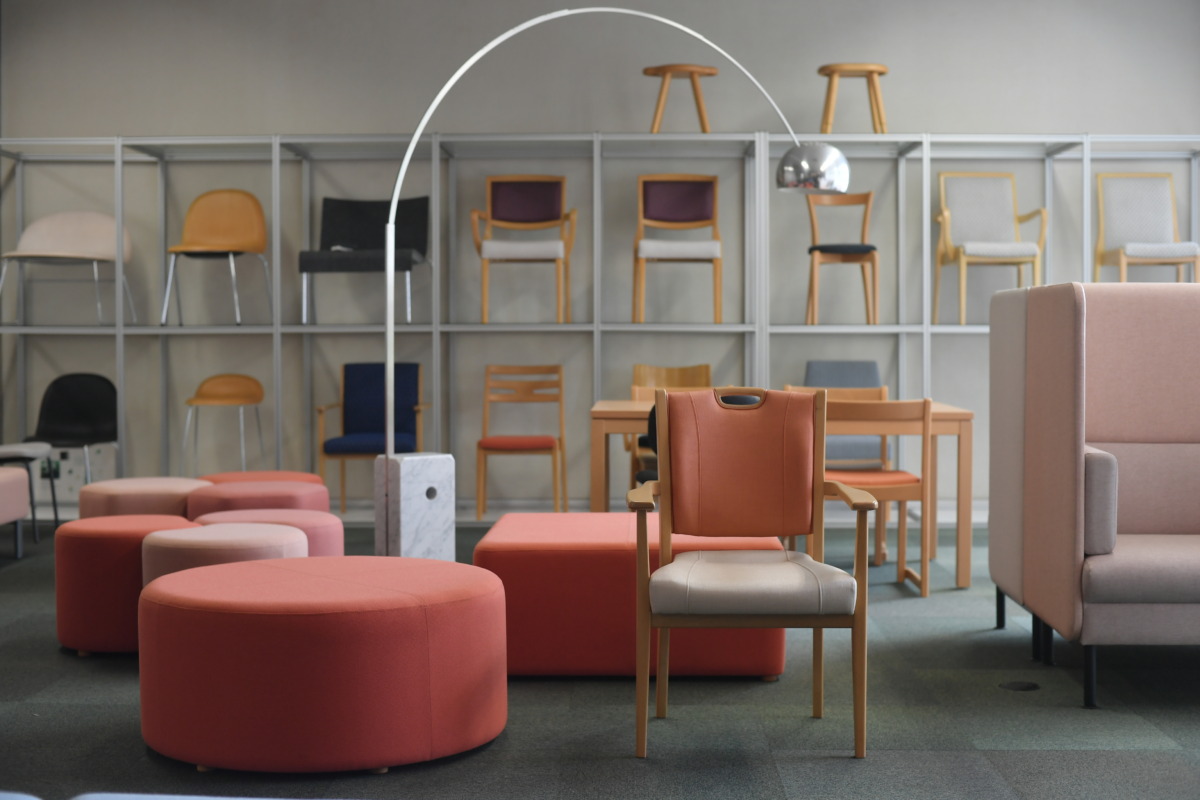 現代美術のミュージアムでも訪れたかのような色鮮やか空間の奥に、さきほどの華やかな印象とは趣が異なる、明るい木目と落ち着きのある張地のチェアやソファが整然と並んでいる。ここは、ナゼロの主力商品である医療介護施設向けの業務用椅子のショールームだ。