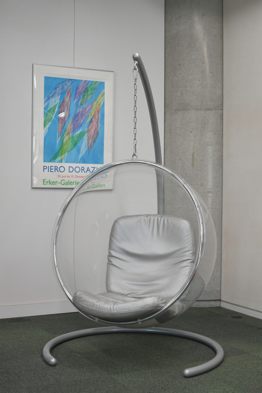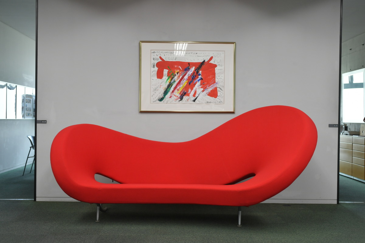 本社一階、受付前には世界的デザイナー、ロン・アラッド氏の作品、全長3m弱の「ビクトリア・ソファ」が鎮座。奥のスペースには、北欧フィンランドのデザイナー、エーロ・アーロニオ氏が手掛けた「ポニー」、「パステルチェア」、「バブルチェア」などが並ぶ。