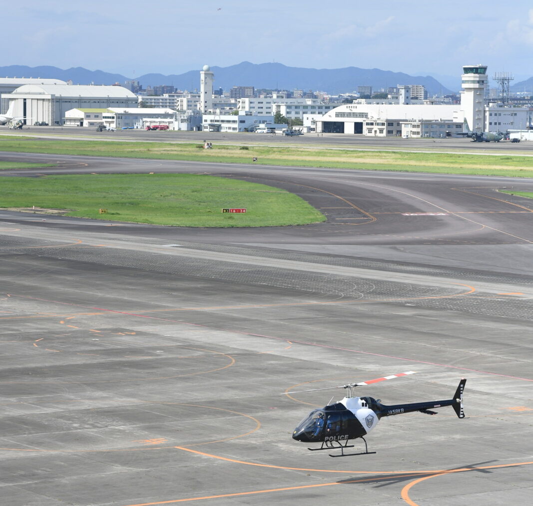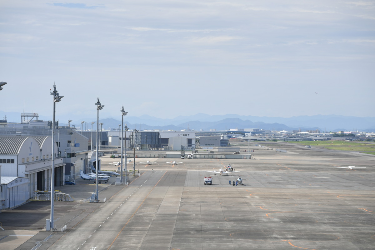 民間のヘリコプターやプライベートの航空機が頻繁に離発着する様子が見られる。奥の建物は自衛隊小牧基地で、取材時も輸送機「C-130H」などが駐機していた。