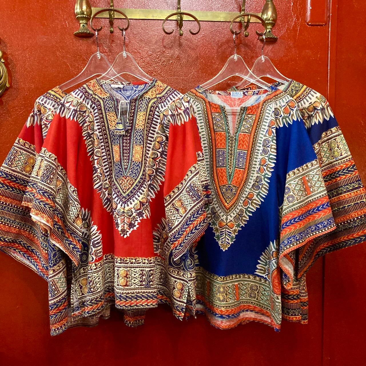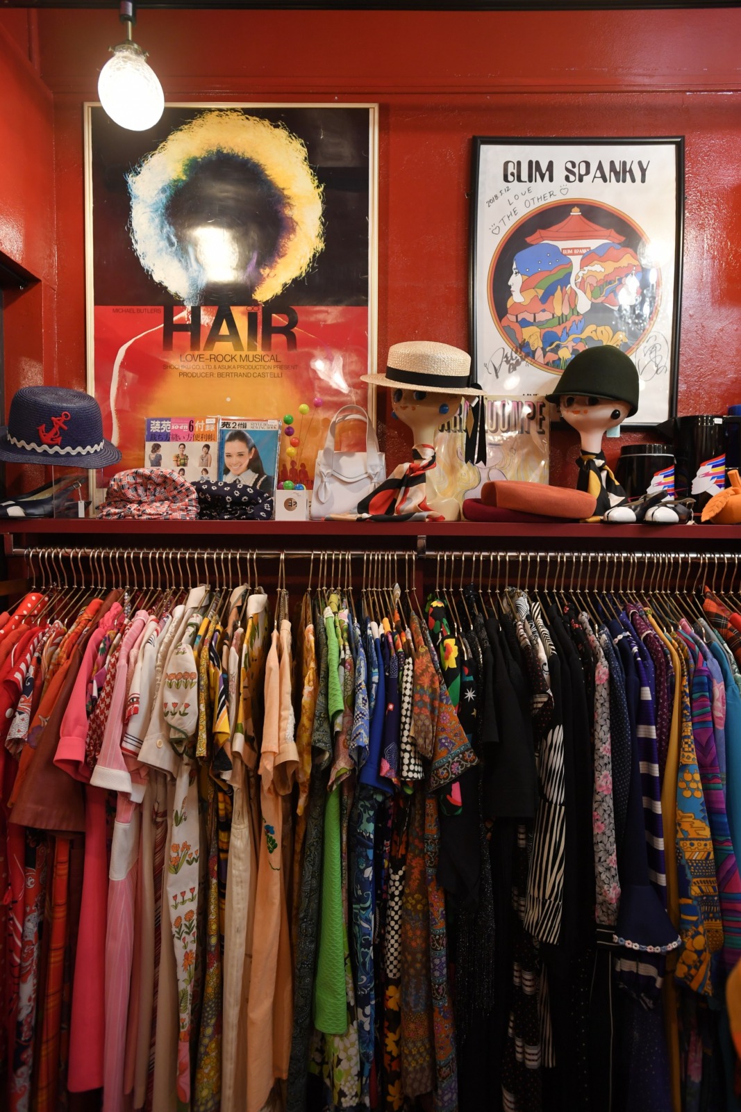真っ赤な店内には、1960~70年代の国内外から仕入れられたサイケデリックな古着や、それらをモチーフにしたオリジナルアイテム、ファッション小物などがラックにぎっしりとディスプレイされている。