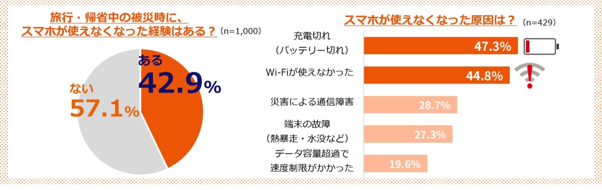 auが行った調査によると、旅行や帰省の際に防災を意識している人は約3割(32.6%)に留まり、被災経験者の4割以上(42.9%)が「旅先で災害時にスマホが使えなくなった」と回答しています。困りごとの上位には「充電切れ」「圏外・電波が不安定」といったスマホ関連が並びます。