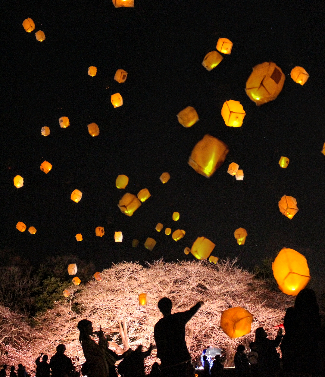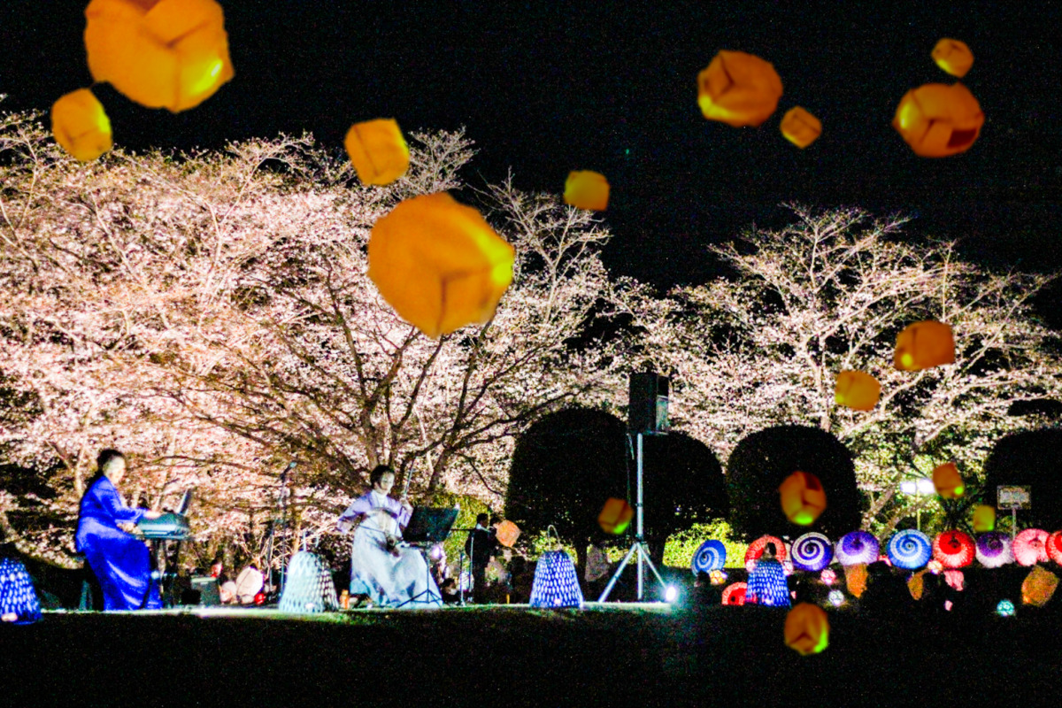ライトアップされた夜桜には日中、お日様の下でのお花見とは違った良さがあります。ここではさらに踏み込んだ夜の絶景をご提案。富士市の「岩本山公園」を舞台に開催されるこのフェスティバルは、日常を忘れさせてくれる輝きに満ちています。このイベントのメインは、なんといっても参加者の願いを込めて一斉に放たれるスカイランタンとライトアップされた夜桜、目を凝らすとうっすらと遠くに見える富士の競演です。