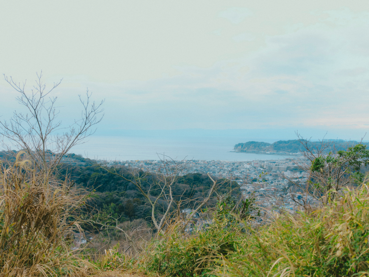平成巡礼道の登山口から30分ほどで、視界がぱっと開けた。衣張山の山頂だ。そこには、鎌倉の市街地から由比ヶ浜、そして遠く相模湾までを一望するパノラマが広がっていた。「山からの海なんて初めて見た」と、うれしそうなレニーくん。早春の冷たくも心地よい風を浴びながら眺める景色に、ふたりの表情も緩む。
